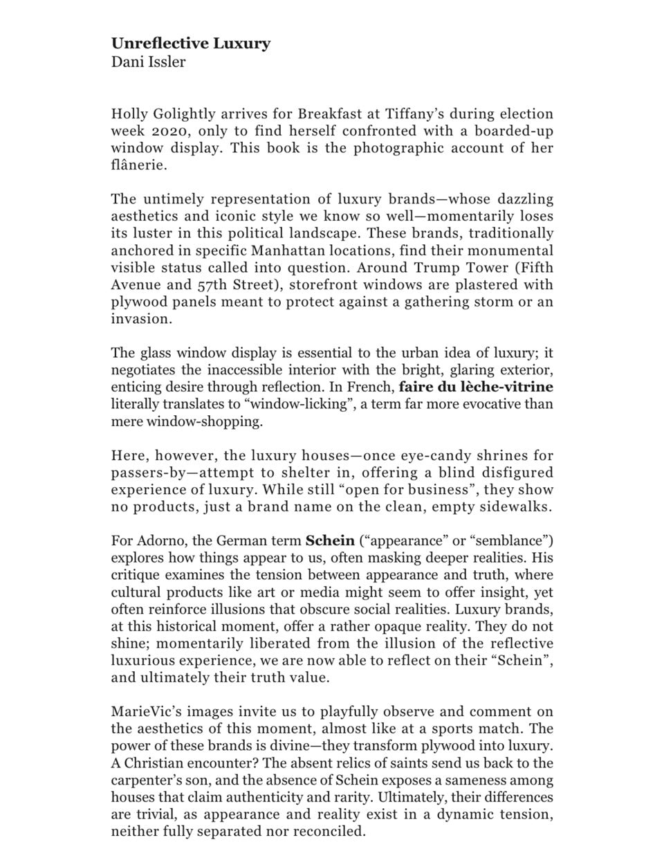 The body of work in the book is a photo project by MarieVic. It was shot in New York City during election week 2020. The work records a sign of the times: when across U.S., city storefronts boarded up ahead of election in anticipation of the violence that could result. Plywood window coverings blanketed the high-end shopping strip, an eerie sight for stores whose extroverted glassed windows are meant to speak a language of enticement. Published by Blurring Books.